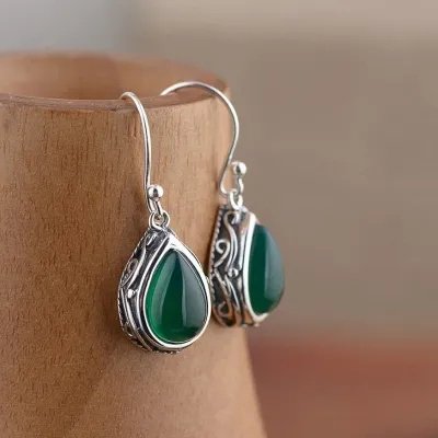 925 Silver Green Agate Drop Earrings – Thai Style Elegant Women Jewelry